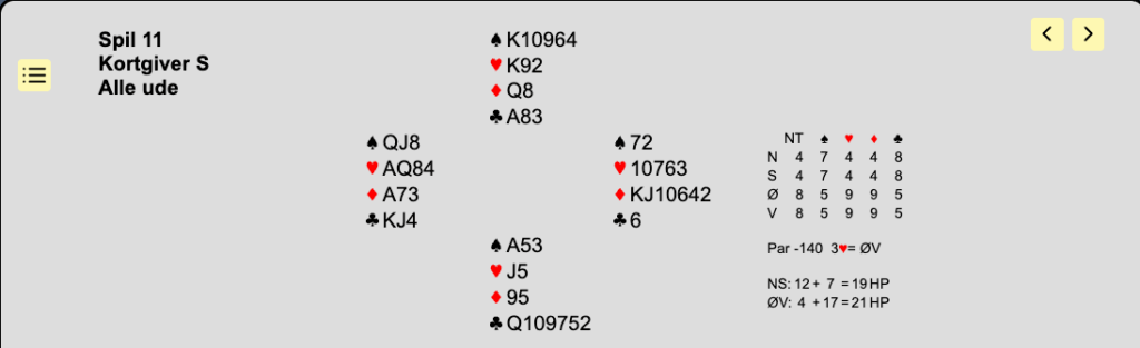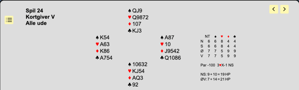 som viser mindst 5โฆ๏ธ, svag hรฅnd. Aktuelt melder makker 3โฅ๏ธ og du passer glad. Hvis modstanderne