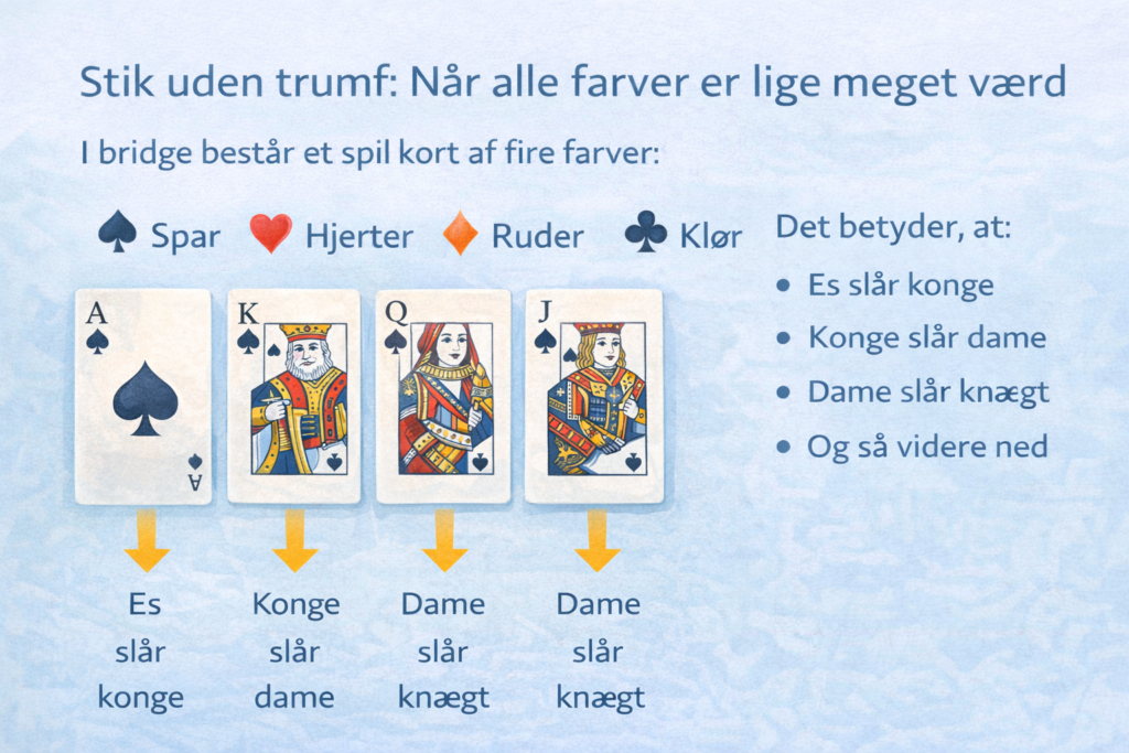 Stik uden trumf er noget af det første, man lærer i bridge – og samtidig noget af det vigtigste at forstå rigtigt. Mange begyndere forbinder bridge med trumf, men i virkeligheden spilles mange spil uden trumf, også kaldet UT eller NT (No Trump).